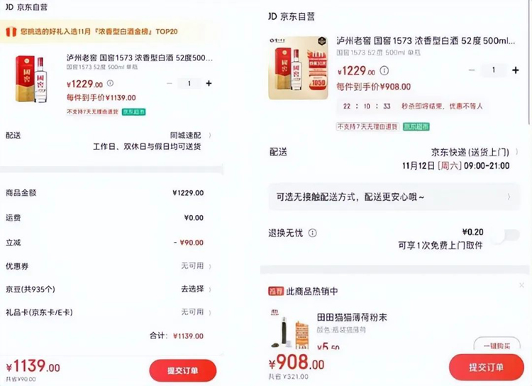 事情的起因,大致是雙十一期間,京東促銷,有消費者爆料疊加優(yōu)惠后,國窖1573最低到手價為908元/瓶。而目前52度500ml的國窖1573單瓶廠商指導價為1499元,批發(fā)參考價在905元左右。在京東平臺,“瀘州老窖官方京東自營旗艦店”,這款酒11月15日的預估到手價為1139元/瓶。