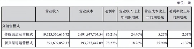 目前,白酒銷售主渠道還在線下,各大品牌90%以上的貨物都靠線下經(jīng)銷。以瀘州老窖為例,年報顯示,2021年瀘州老窖傳統(tǒng)渠道實現(xiàn)營業(yè)收入195.24億元,同比增長24.4%,毛利率86.21%;新興渠道運營實現(xiàn)的營業(yè)收入為8.92億元,同比增長18.26%,毛利率78.27%。