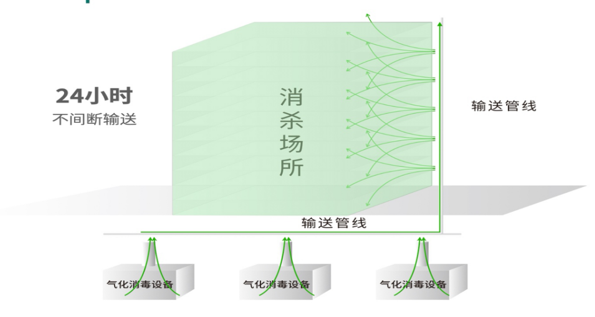通過(guò)管道的輸送方法,確保一臺(tái)機(jī)器無(wú)死角消殺范圍達(dá)250-300平方米,管道可視場(chǎng)地需求通過(guò)軟管和硬管兩種不同輸送方式。