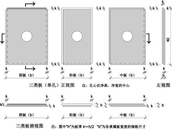 附圖說明:上圖為坎式模板之中的單孔模板,除此之外還有“單排2 孔、3 孔、4 孔”及“雙排4 孔、6 孔、8 孔”等未在圖示之內(nèi)。由于模板邊緣坎的分布位置不同造成模板的兩個面尺寸會不相同,圖中把“雙面”模板中的設(shè)定的規(guī)格尺寸面用淺灰色表示(標(biāo)色),這其中中板寬度的兩個面均與規(guī)格尺寸同(只是板兩面成對角菱形斜槎)均用“淺灰”色(標(biāo)色);陰板非規(guī)格面比規(guī)格尺寸小的模板面采用“深灰”色(標(biāo)色);陽板的非規(guī)格面比規(guī)格尺寸大的模板面采用“乳白”色(標(biāo)色)。圖中“h”表示為模板厚度,“k”表示為坎式邊緣的寬度及厚度,k=h/2(二分之一板厚);“b”為各隸屬板寬度的規(guī)格尺寸。