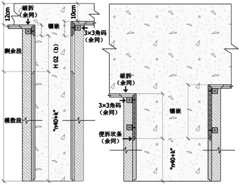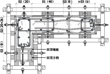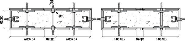 [注]:圖中表示方式及拼模時應(yīng)注意的事項同前,縱向“03(非)”段,所采用的“體外對拉”及“單邊拉結(jié)”均按照“自制板”應(yīng)采用“頂托”替代“內(nèi)頂蓋”,“單拉錨固”螺桿適用于柱端砌墻段,可方便安裝墻體拉結(jié)筋(參見上圖)。橫向“陰陽面”采用“02(非)的組合,當(dāng)“02(非)”寬度大于 10cm 時需設(shè)置對拉螺桿。圖中其他表示方式及拼模方法同前,其中括號內(nèi)的“40”“20”為隸屬序號板的具體規(guī)格(厘米),“20+2k”表示為“加碼面”尺寸。