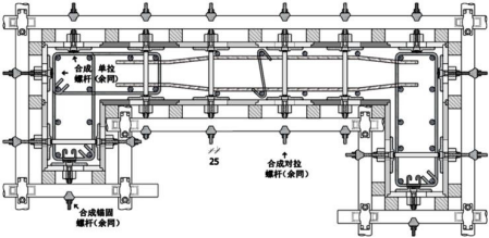 用“單邊拉結(jié)”同樣能起“連接”作用(見圖左、右兩上角),使“小規(guī)格”得以很好拼模。圖中還展示了“擴(kuò)展型穿螺桿孔”螺桿可向“孔”中心側(cè)移(最大25mm)能避開直徑30mm之內(nèi)的所有豎向鋼筋。另外,墻板陰角模板尺寸較小時(一般陰板的設(shè)置不小于30cm、中板不小于25cm)。