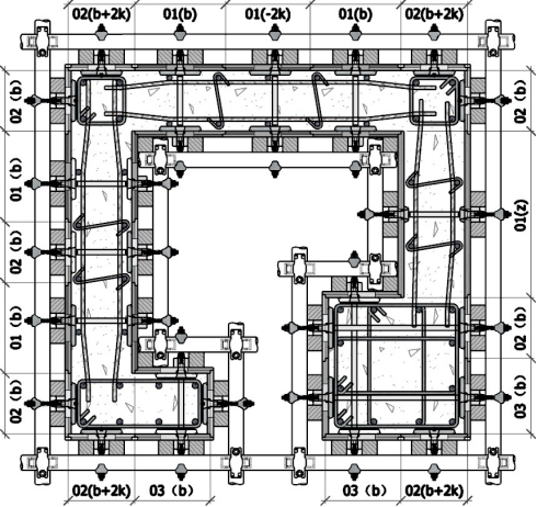 圖中寬度標(biāo)注中的序號“01”、“02”、“03”分別代表“陰板”、“陽板”、“中板”,括號內(nèi)的“b”表示為隸屬于序號板的所有寬度規(guī)格尺寸,其中“b+2k”表示為陽板的加碼面,“b-2k”表示為陰板的減碼面,“01(z)”表示為陰板的自制(非標(biāo)規(guī)格仿制)板。上圖采用了縱向(y 軸)“規(guī)格面對齊”區(qū)段統(tǒng)一;橫向(x 軸)“其他面入槽”區(qū)段統(tǒng)一。“區(qū)段統(tǒng)一”是指一個相對獨(dú)立的區(qū)段,這個區(qū)段如果是在地下室(含外墻板)就會相當(dāng)大,可以依后澆帶為界,也可以通過設(shè)立“非標(biāo)準(zhǔn)”段來劃分,施工時需要協(xié)調(diào)。