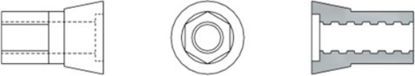 說明:圖左為“錐頂螺母”主視圖,中為側(cè)視圖,右為剖視圖,“錐頂螺母”一端為外六角,中間段為圓柱,另一端為錐面體(中間凹槽內(nèi)設(shè)橡膠墊片),整個中心是“T12內(nèi)螺紋”(可以擰在螺桿上)。