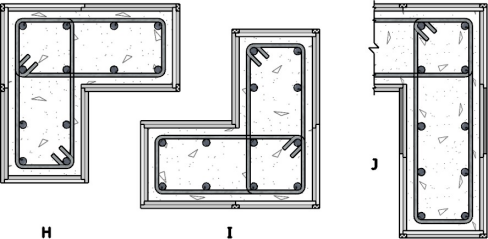 以上 A~J 圖均為豎向構(gòu)件(柱、墻板)的模板拼模平面圖。圖中模板的色標(biāo)(同前)“淺灰”為模板的規(guī)格尺寸面,“乳白”為陽板的“加碼面”,“深灰”為陰板的“減碼面”。