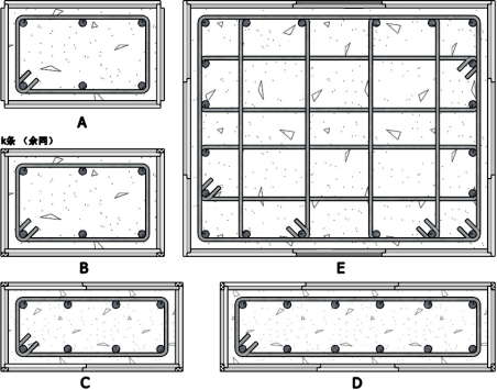 圖 E 為陽板的“替代擴(kuò)延”來完成較大尺寸矩形柱的拼模,其中橫(x)向采用“標(biāo)碼替代”(組合標(biāo)碼)“規(guī)格面對齊”,縱(y)向采用“加碼替代”(組合加碼),對入角部 90o相交板的坎槽中。