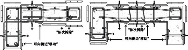 (2)雙拆條件”:當(dāng)“依次拆?!钡疥幗菚r,組成陰角(90o)的兩塊模板在寬度方向同時均有可向“側(cè)邊”移動的“空間”(見之下的“可向側(cè)邊移動”參考圖)。