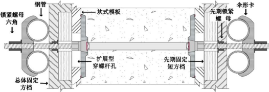 墻板拐角橫向或縱向螺桿均有發(fā)生“碰撞”概率。所以在固定位穿螺桿孔孔徑設(shè)置時采用了“擴(kuò)展孔”孔徑設(shè)定為 7.5cm,在體系其他構(gòu)件的協(xié)同下可避免上述兩種“碰撞”。