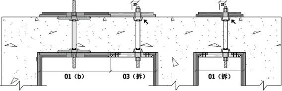3、單邊拉結(jié)(僅用于無須對拉的構(gòu)件部位)及單邊拉結(jié)錨固螺桿組合(用于拉墻筋部位)示意圖